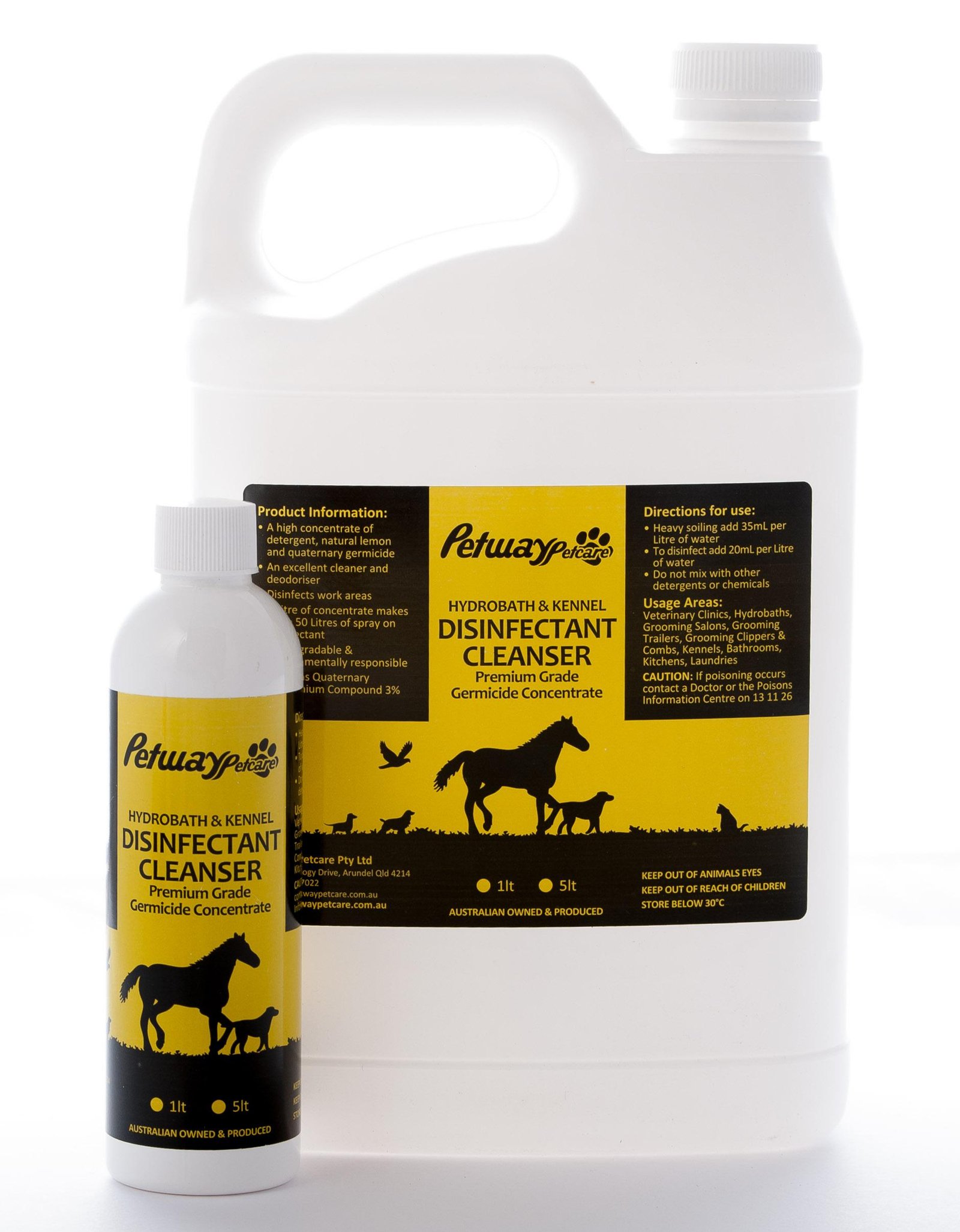 A highly concentrated detergent and quaternary germicide that can be used as an excellent cleaner, deodoriser and disinfectant, leaving a fresh, clean lemon grass fragrance. May be used to clean baths, basins, toilets, showers, tiles, kennels, salons, vet clinics work areas, hydrobaths, work benches, stables, horse trailers etc. Can also be used to clean grooming equipment, such as scissors and blades; make sure you dry these thoroughly after they have been disinfectant. One litre of concentrate makes up to 50 litres of spray on disinfectant. Bio-degradable and environmentally responsible Can be used in bathrooms, kitchens & laundries Directions for use: Heavy soiling add 35ml per litre of water. To disinfect add 20ml per litre of water. Do not mix with other detergents or chemicals.