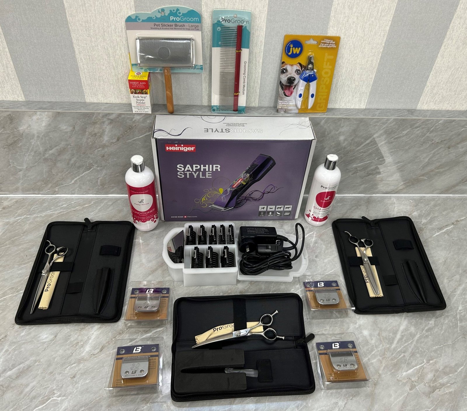 Includes a Heiniger Saphir Clipper, premium scissors, blades, brushes, shampoo, conditioner, nail clippers, and combs—everything you need to start grooming with confidence and precision.